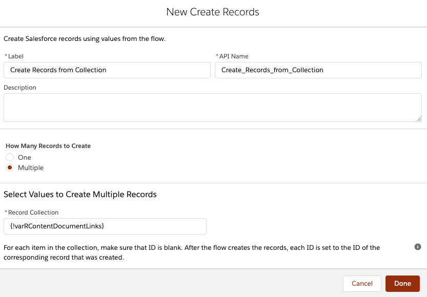 - Add a create records element to insert data from the record collection variable (Content Document Link)