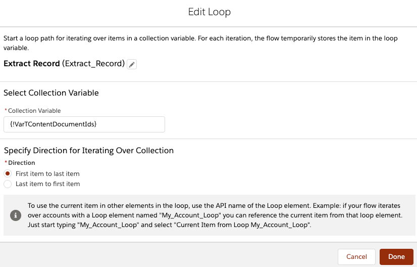 - Add a loop element to extract records from collection variable (Content Document IDs)