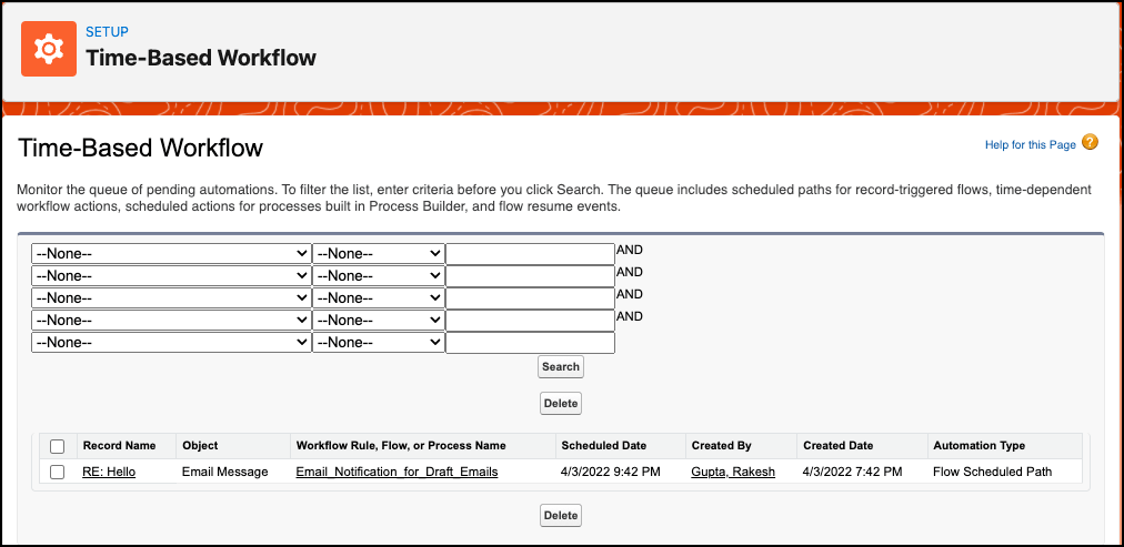 - Navigate to Setup (Gear Icon) | Environments | Monitoring | Time-Based Workflow.