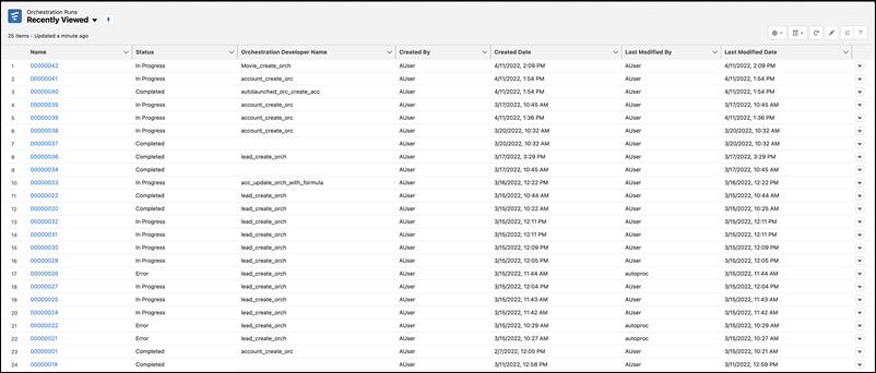 - Use Improved Orchestrator List Views: – Use the Recently Viewed list view for orchestrator runs and orchestrator work items to limit the items you view. Use the new Orchestration Developer Name column in Orchestration Runs list views to identify the API name of the orchestration associated with an orchestration run. Completed, canceled, or failed orchestration runs with no orchestration developer name indicate that the orchestration was deleted from the Flows page in Setup.