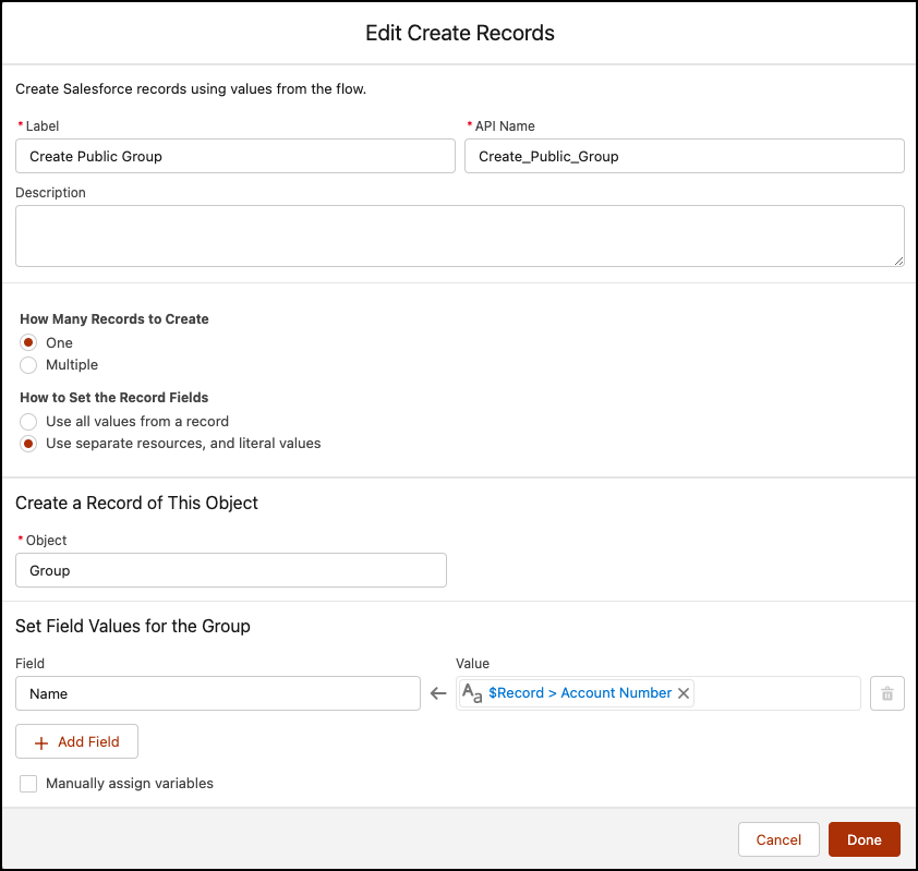 The next step is to create a public group, as soon as an account gets enabled as a Partner account. For this, we will use the Create Records element.