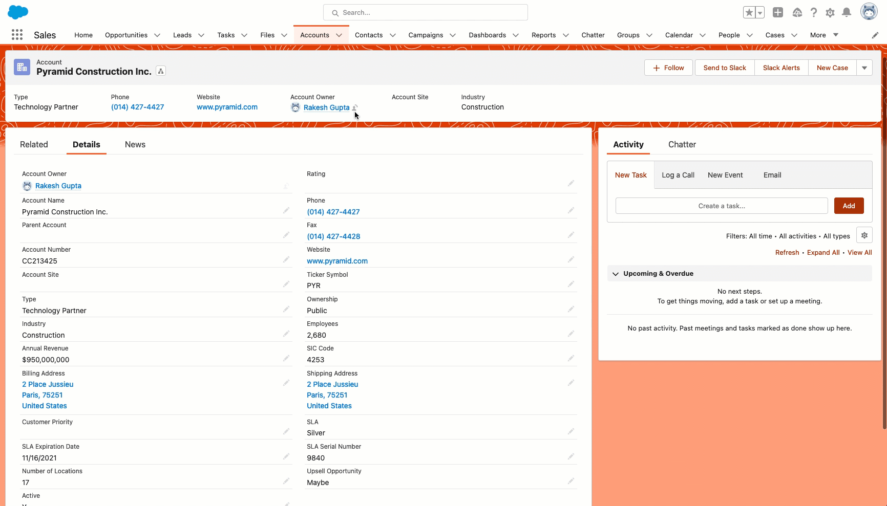 - Navigate to the Account tab and update the account Pyramid Construction Inc. owner to Nathan Gilmore, as shown in the following screenshot: