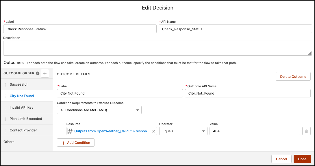 Now we will use the Decision element to check the OpenWeather API response code.